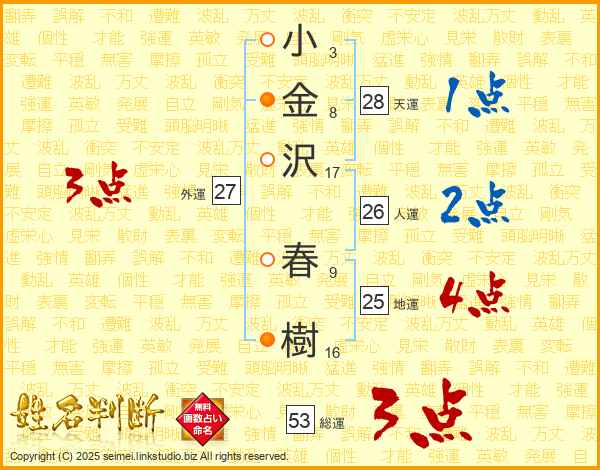 小(3画)金(8画)沢(17画) 春(9画)樹(16画)