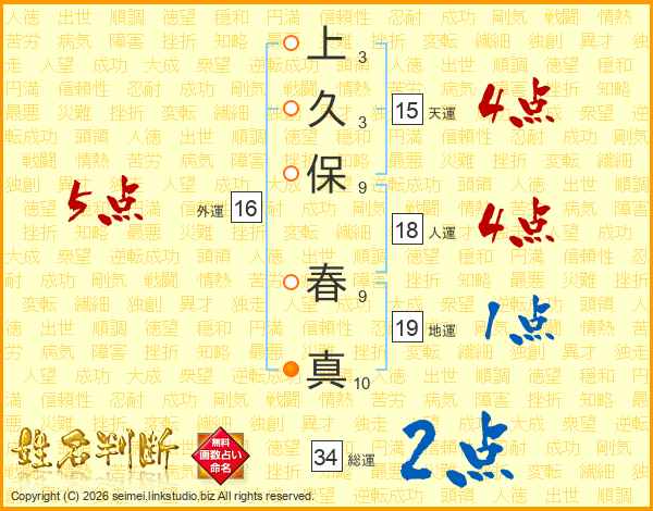 上(3画)久(3画)保(9画) 春(9画)真(10画)