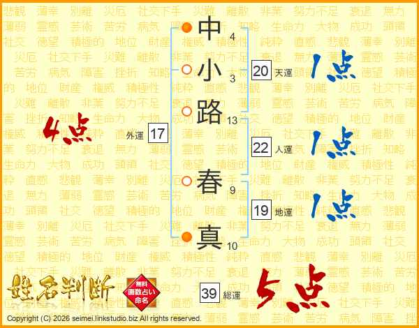 生活面を象徴する運勢です。外部から受ける影響力を表し、結婚運、家庭運や職場、環境への順応性を表します。総運から人運を引いた画数。姓や名が1文字の場合を除く。