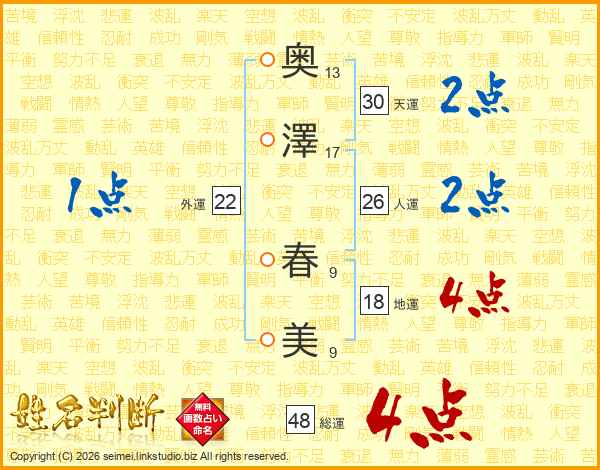 あなたの人生を表す1番重要な運勢です。生涯を通じて影響する総合運となり、主に50歳以降の晩年期に影響を及ぼします。苗字と名前の合計画数。