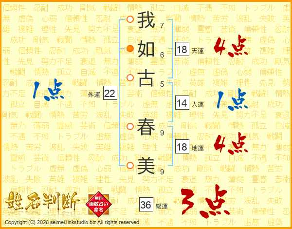 生活面を象徴する運勢です。外部から受ける影響力を表し、結婚運、家庭運や職場、環境への順応性を表します。総運から人運を引いた画数。姓や名が1文字の場合を除く。
