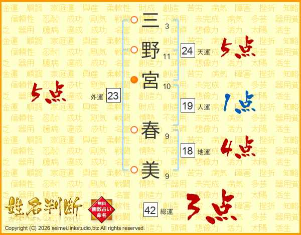 三(3画)野(11画)宮(10画) 春(9画)美(9画)