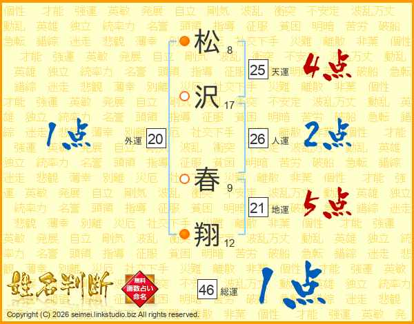 松(8画)沢(17画) 春(9画)翔(12画)