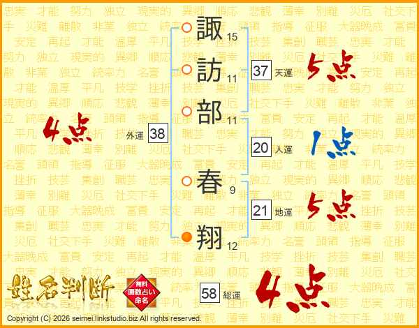 諏訪部春翔さんの総運は58画の4点!