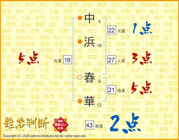 中浜春華さんの総運は43画の2点!