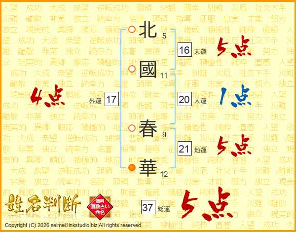 あなたの人生を表す1番重要な運勢です。生涯を通じて影響する総合運となり、主に50歳以降の晩年期に影響を及ぼします。苗字と名前の合計画数。