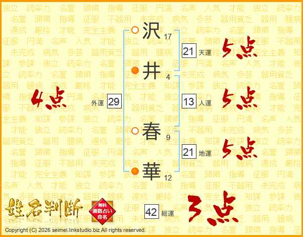 あなたの人生を表す1番重要な運勢です。生涯を通じて影響する総合運となり、主に50歳以降の晩年期に影響を及ぼします。苗字と名前の合計画数。