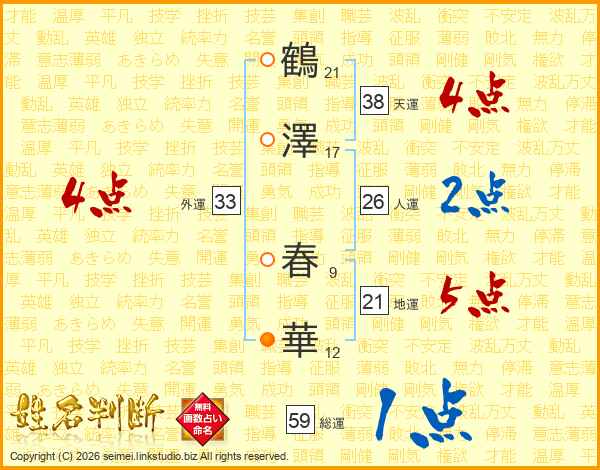 鶴(21画)澤(17画) 春(9画)華(12画)