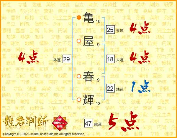 亀(16画)屋(9画) 春(9画)輝(13画)