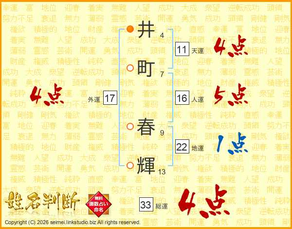 生活面を象徴する運勢です。外部から受ける影響力を表し、結婚運、家庭運や職場、環境への順応性を表します。総運から人運を引いた画数。姓や名が1文字の場合を除く。