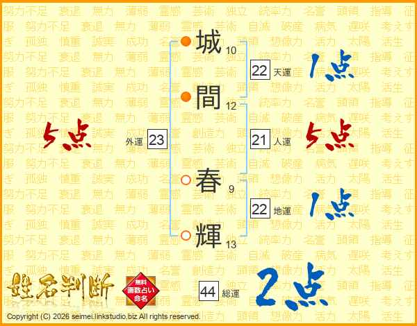 あなたの人生を表す1番重要な運勢です。生涯を通じて影響する総合運となり、主に50歳以降の晩年期に影響を及ぼします。苗字と名前の合計画数。