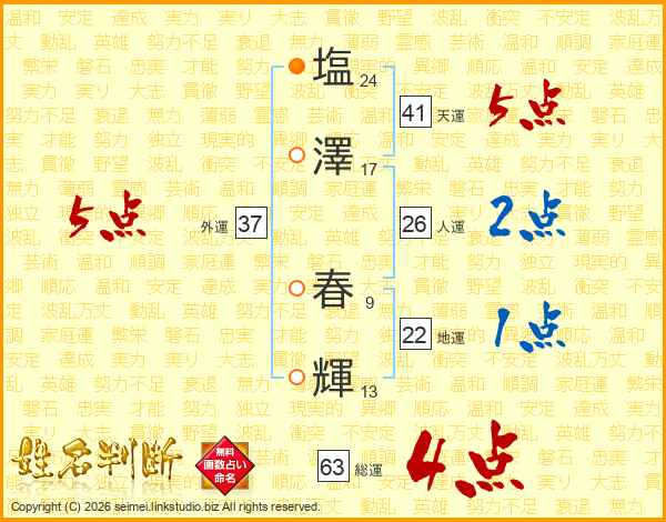 塩(24画)澤(17画) 春(9画)輝(13画)