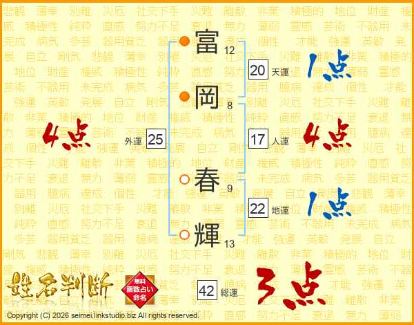 生活面を象徴する運勢です。外部から受ける影響力を表し、結婚運、家庭運や職場、環境への順応性を表します。総運から人運を引いた画数。姓や名が1文字の場合を除く。