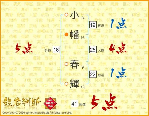 小(3画)幡(16画) 春(9画)輝(13画)