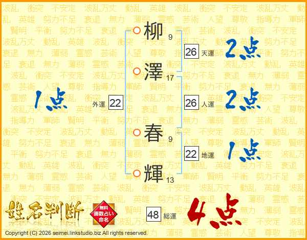 柳(9画)澤(17画) 春(9画)輝(13画)