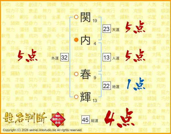 関(19画)内(4画) 春(9画)輝(13画)
