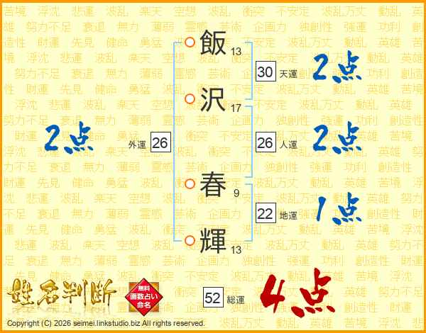 飯(13画)沢(17画) 春(9画)輝(13画)