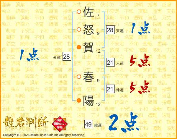佐(7画)怒(9画)賀(12画) 春(9画)陽(12画)