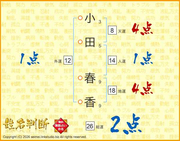 生活面を象徴する運勢です。外部から受ける影響力を表し、結婚運、家庭運や職場、環境への順応性を表します。総運から人運を引いた画数。姓や名が1文字の場合を除く。