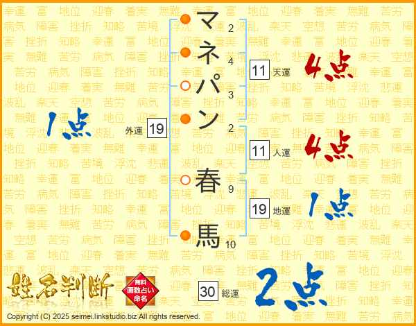 マ(2画)ネ(4画)パ(3画)ン(2画) 春(9画)馬(10画)