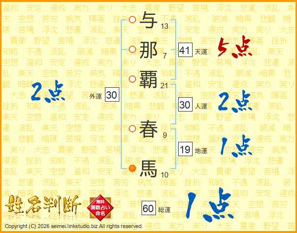 与(13画)那(7画)覇(21画) 春(9画)馬(10画)