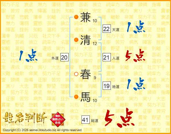 兼清春馬さんの総運は41画の5点!