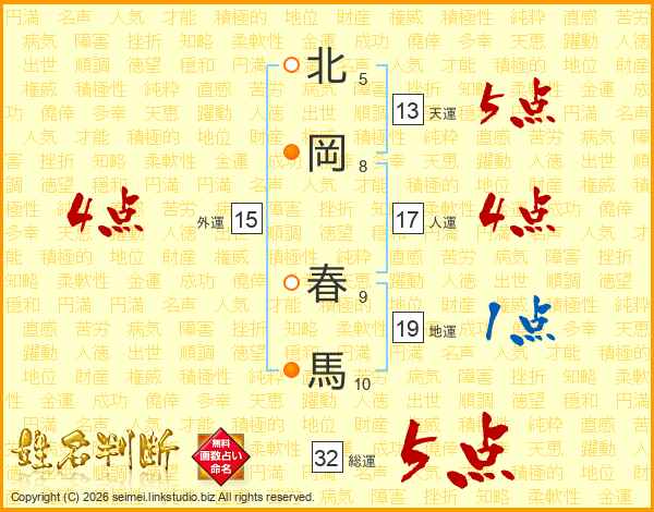 北岡春馬さんの総運は32画の5点!
