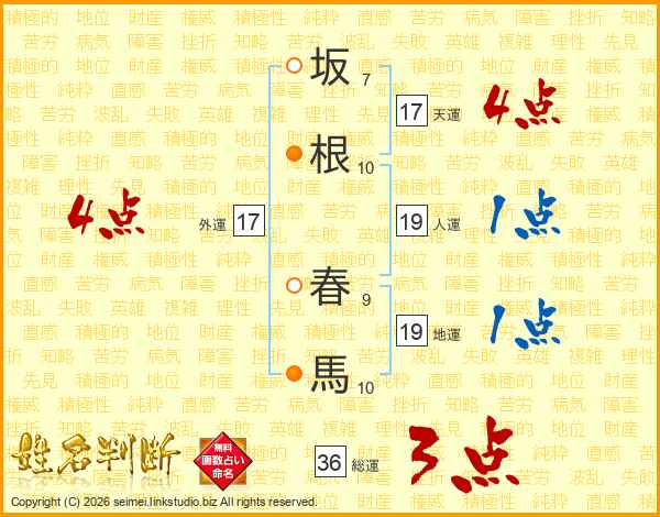 あなたの人生を表す1番重要な運勢です。生涯を通じて影響する総合運となり、主に50歳以降の晩年期に影響を及ぼします。苗字と名前の合計画数。
