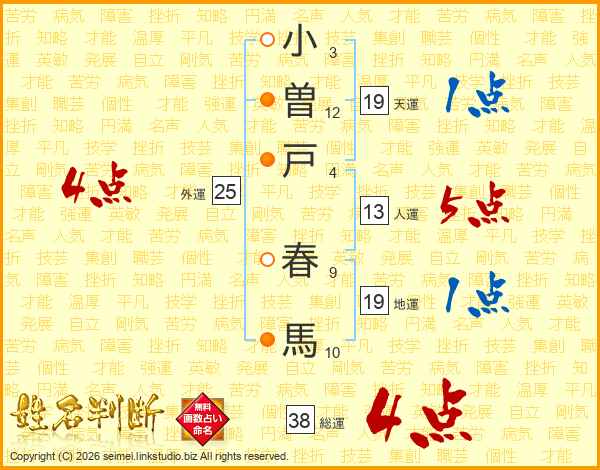小曽戸春馬さんの総運は38画の4点!