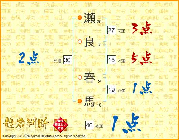 瀬良春馬さんの総運は46画の1点!