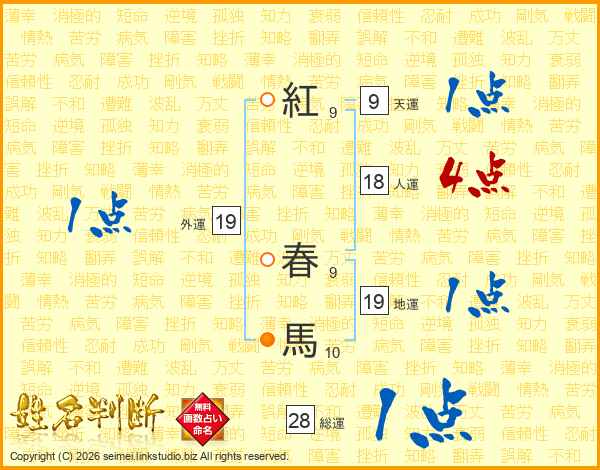 生活面を象徴する運勢です。外部から受ける影響力を表し、結婚運、家庭運や職場、環境への順応性を表します。総運から人運を引いた画数。姓や名が1文字の場合を除く。
