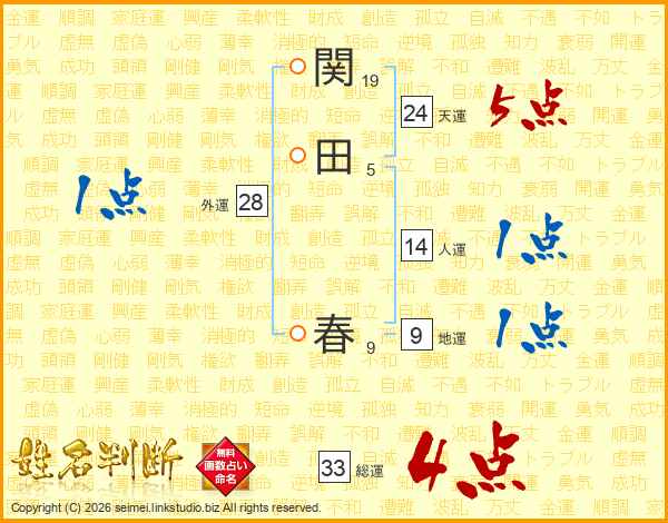 生活面を象徴する運勢です。外部から受ける影響力を表し、結婚運、家庭運や職場、環境への順応性を表します。総運から人運を引いた画数。姓や名が1文字の場合を除く。