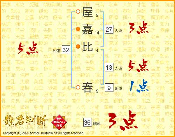 屋(9画)嘉(14画)比(4画) 春(9画)