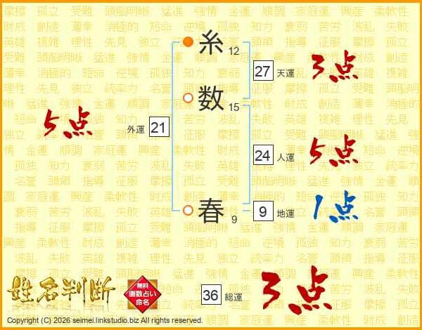 生活面を象徴する運勢です。外部から受ける影響力を表し、結婚運、家庭運や職場、環境への順応性を表します。総運から人運を引いた画数。姓や名が1文字の場合を除く。