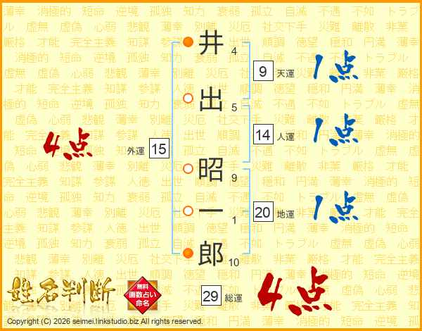 井(4画)出(5画) 昭(9画)一(1画)郎(10画)
