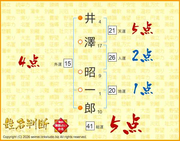 井(4画)澤(17画) 昭(9画)一(1画)郎(10画)