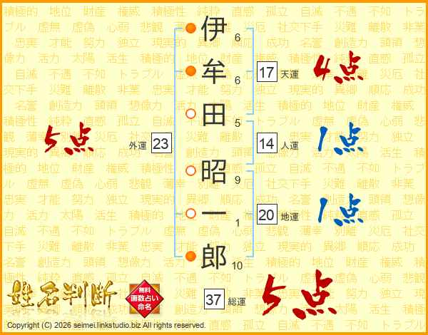 伊(6画)牟(6画)田(5画) 昭(9画)一(1画)郎(10画)