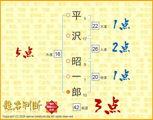 平(5画)沢(17画) 昭(9画)一(1画)郎(10画)