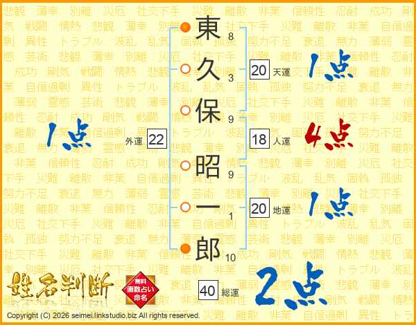 東(8画)久(3画)保(9画) 昭(9画)一(1画)郎(10画)