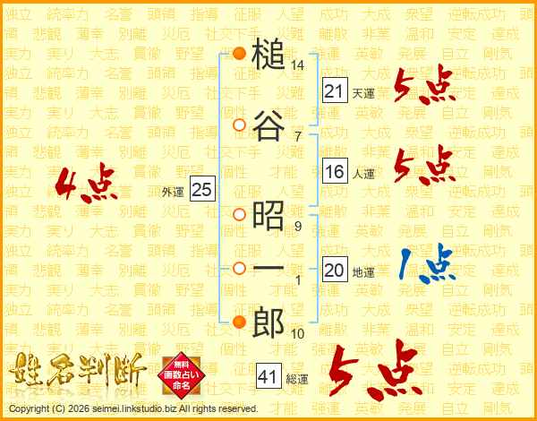 槌(14画)谷(7画) 昭(9画)一(1画)郎(10画)