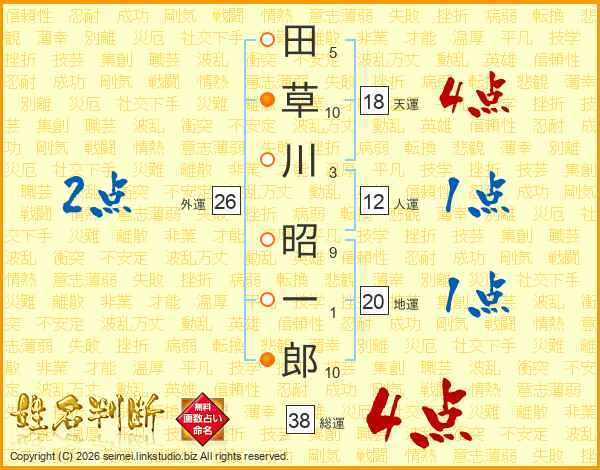 田(5画)草(10画)川(3画) 昭(9画)一(1画)郎(10画)