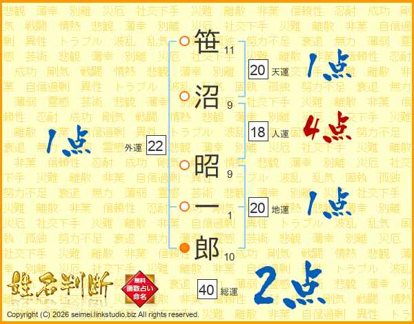 笹沼昭一郎さんの天運は20画の1点!