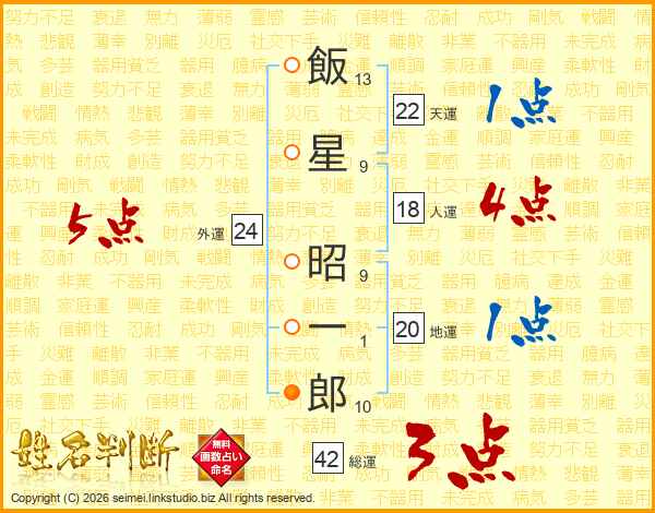 飯(13画)星(9画) 昭(9画)一(1画)郎(10画)