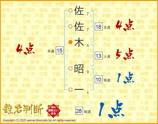 佐(7画)佐(7画)木(4画) 昭(9画)一(1画)