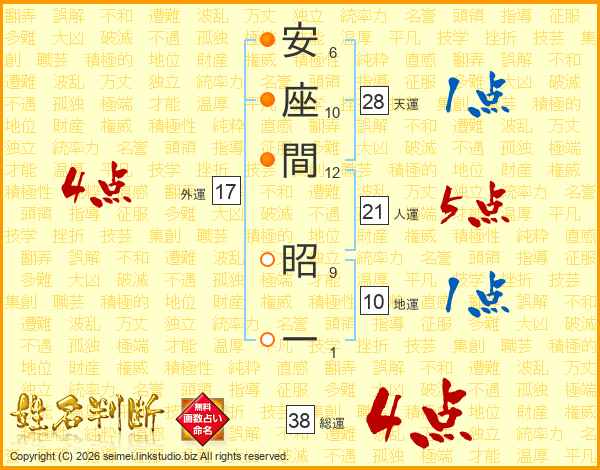 安(6画)座(10画)間(12画) 昭(9画)一(1画)