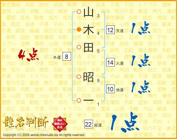 山(3画)木(4画)田(5画) 昭(9画)一(1画)