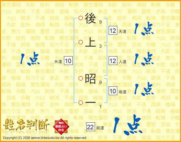 生活面を象徴する運勢です。外部から受ける影響力を表し、結婚運、家庭運や職場、環境への順応性を表します。総運から人運を引いた画数。姓や名が1文字の場合を除く。