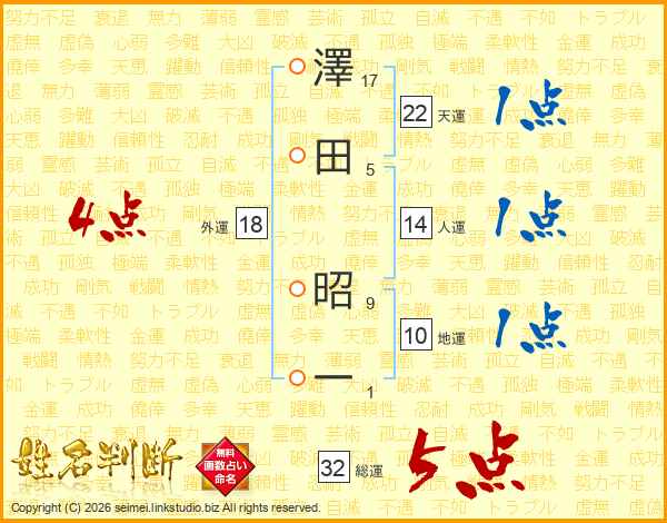 生活面を象徴する運勢です。外部から受ける影響力を表し、結婚運、家庭運や職場、環境への順応性を表します。総運から人運を引いた画数。姓や名が1文字の場合を除く。