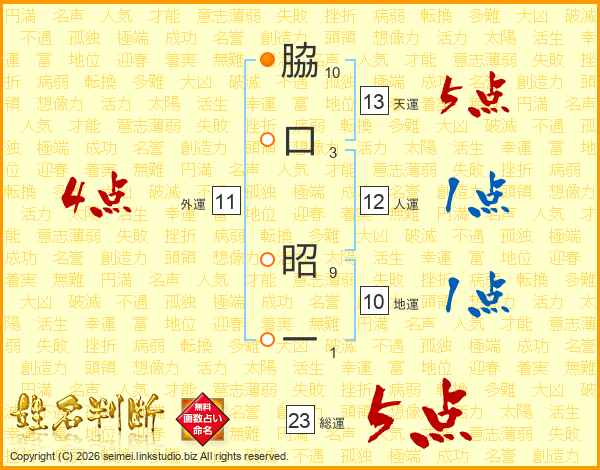 生活面を象徴する運勢です。外部から受ける影響力を表し、結婚運、家庭運や職場、環境への順応性を表します。総運から人運を引いた画数。姓や名が1文字の場合を除く。