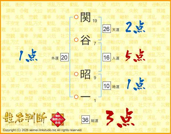 あなたの人生を表す1番重要な運勢です。生涯を通じて影響する総合運となり、主に50歳以降の晩年期に影響を及ぼします。苗字と名前の合計画数。